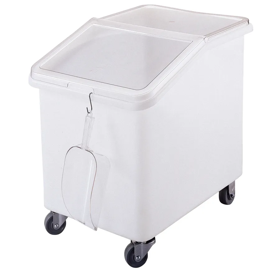 Heavy duty polycarbonate construction , Clear polycarbonate break-resistant lid for easy viewing of contents , Sloped two-piece lid allows easy access even when stored under a counter and facilitates cleaning , Special design enables spilled liquids to drain back off lid while protecting contents , Type: Ingredient Bins, Colour: White, Material: Polycarbonate, Volume: 142.6 kg, Product Type: Sloped 2 Piece Lid, Style: With Hook For Scoop