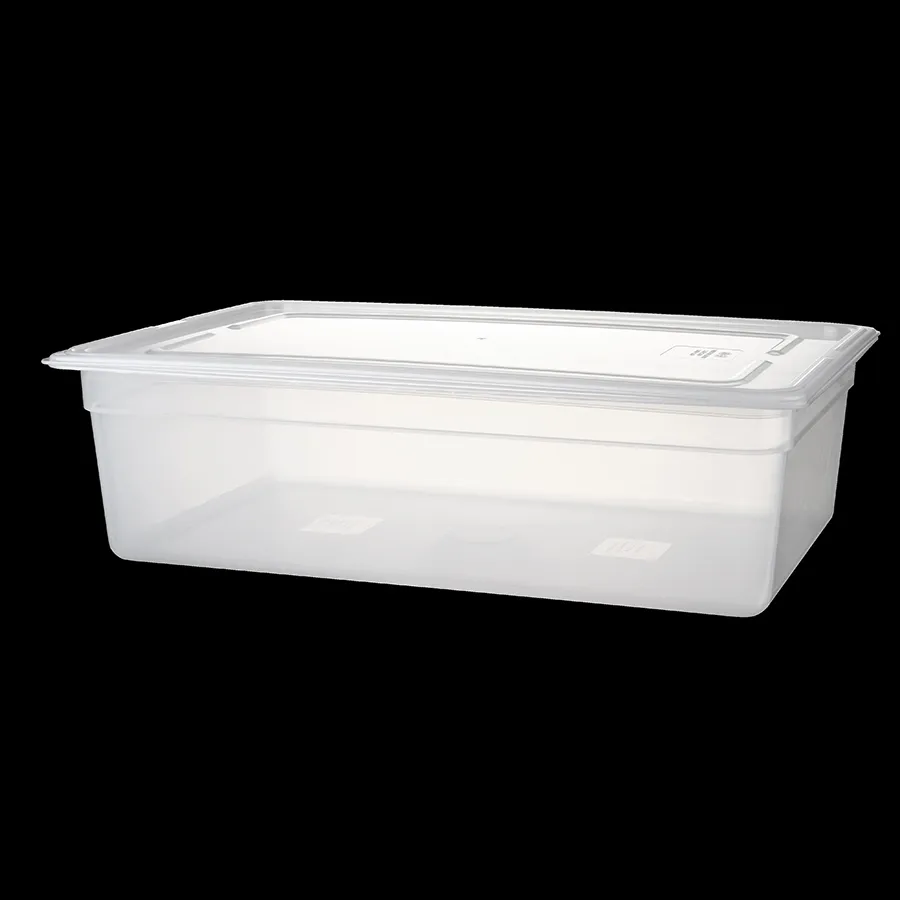 LFGB certificated, Dishwasher Safe, Temperature Range -40°C to +70°C, Stackable , Lids sold separately (EI056) , BPA Free, Drainers sold separately (EI062), Not suitable on direct heat or in a microwave - ideal for food storage keep warm and display, Range: Polypropylene Gastronorms, Type: GN Pans, Colour: Clear, Material: Polypropylene, Capacity: 19.49 ltr, Gastronorm Size: 1/1, Shape: Rectangular