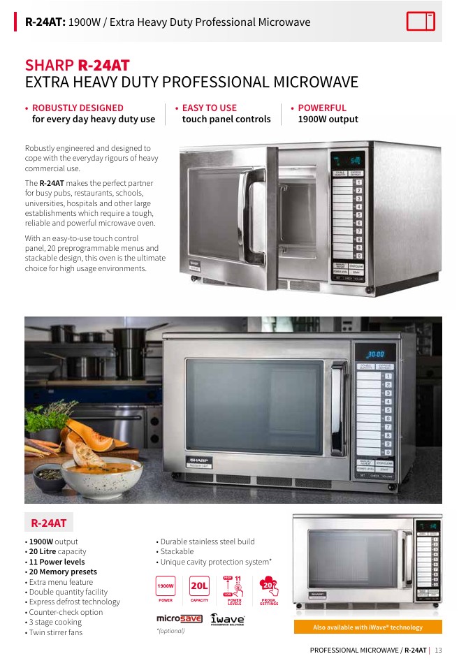Robustly engineered and designed to cope with the everyday rigours of heavy commercial use. The R-24AT makes the perfect partner for busy pubs, restaurants, schools, universities, hospitals and other large establishments which require a tough, reliable and powerful microwave oven. With an easy-to-use touch control panel, 20 pre programmable menus and stackable design, this oven is the ultimate choice for high usage environments. This microwave is easy to use with consistent quality results every time.