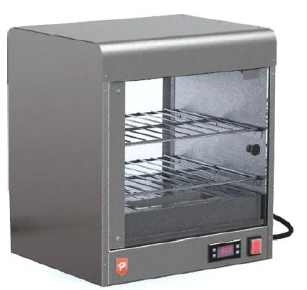 - Square heated pie cabinet with 2 wire removable shelves holding approximately 10 pies per shelf