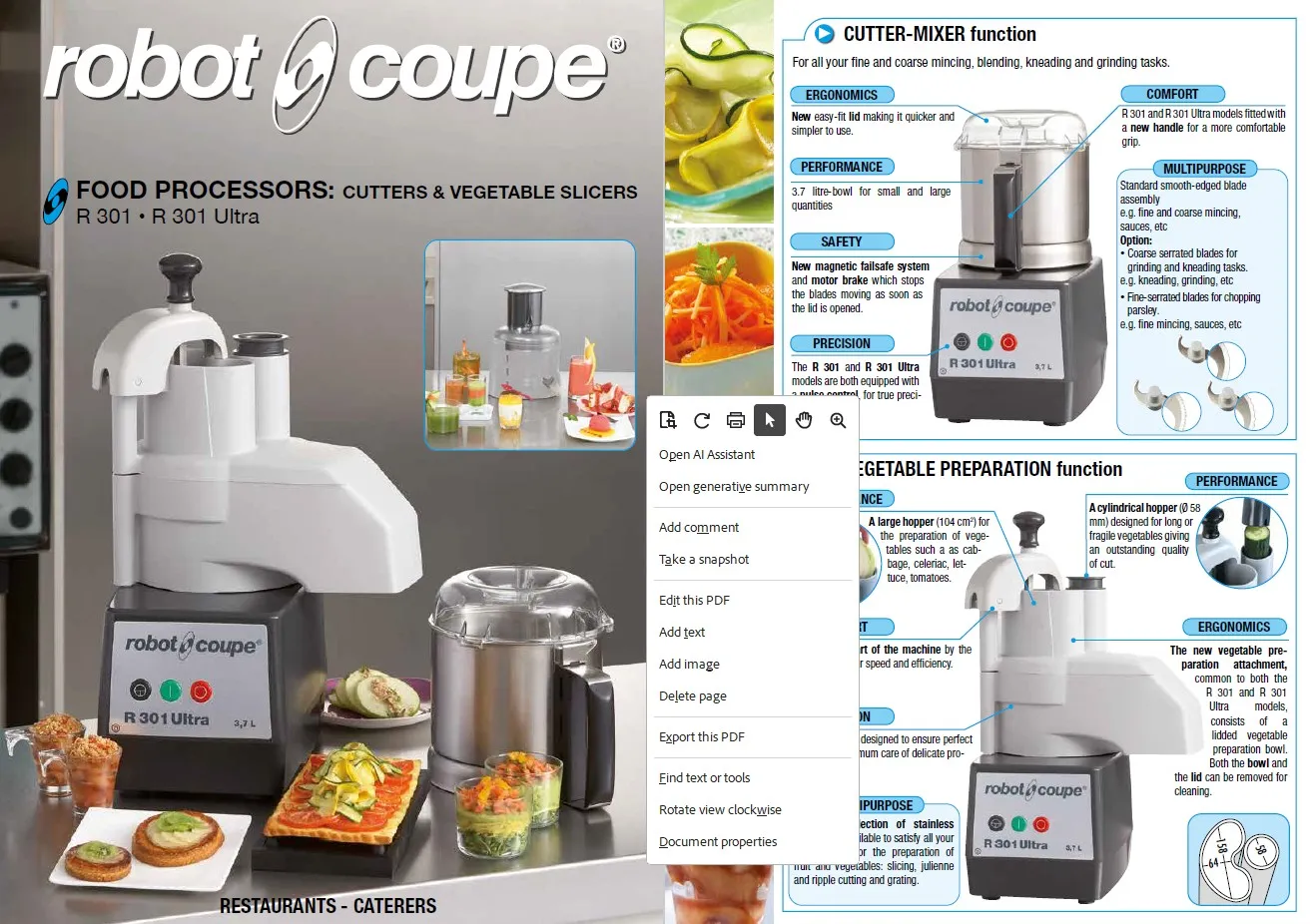 - 2 machines in 1.Cutterbowl for coarse and fine mincing, sauces, emulsions, Veg prep attachment for slicing and grating - as standard. They easily chop, grind, knead, mix and thanks to their complete selection of discs, grate, slice, julienne and for R402 and bigger models, dice and make French fries to perfection. They can perform any number of tasks, which you will gradually discover as you use them.