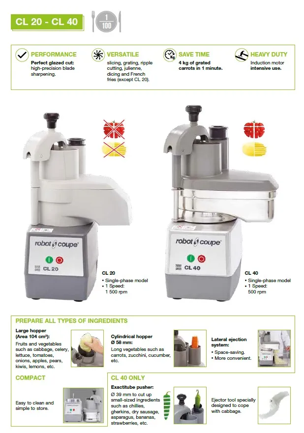 The CL40 Vegetable Preparation Machine is ideal for slicing, ripple cutting, grating, dicing, shredding and making French fries from all types of fruit and vegetables speeding up the time you take to prepare for service