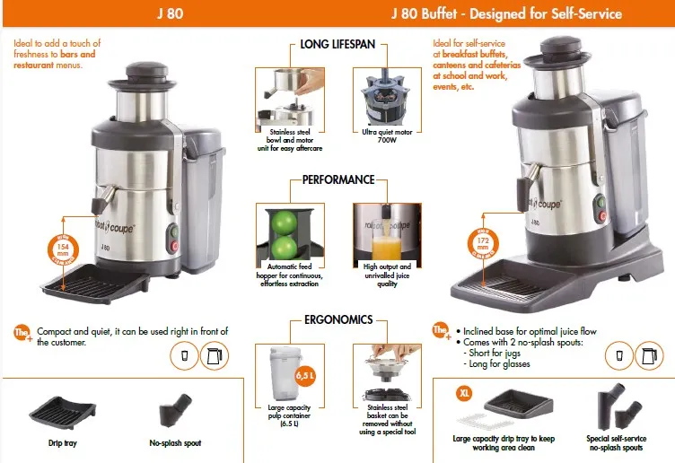 The J80 automatic juice extractor has all the qualities you could ask for in a juicer, fast, resilient, efficient producing top quality juice! Perfect for juice bars and breakfast buffets