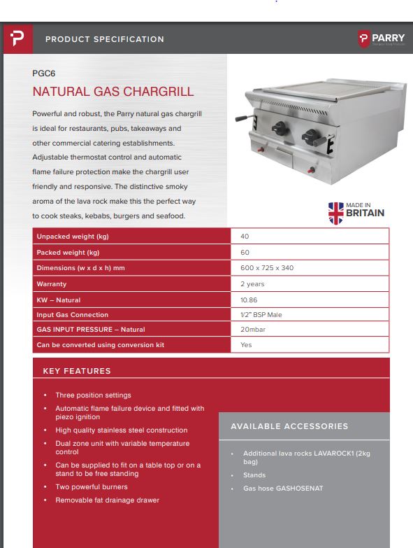 Powerful and robust, the Parry natural gas chargrill is ideal for restaurants, pubs, takeaways and other commercial catering establishments. Adjustable thermostat control and automatic flame failure protection make the chargrill user friendly and responsive. The distinctive smoky aroma of the lava rock make this the perfect way to cook steaks, kebabs, burgers and seafood