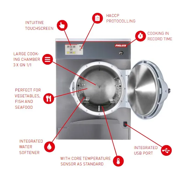 By combining steam and pressure, the PALUX Pressure Steamer prepares your food reliably, economically and gently in a matter of minutes. Even at peak times, fast and reliable pre-production