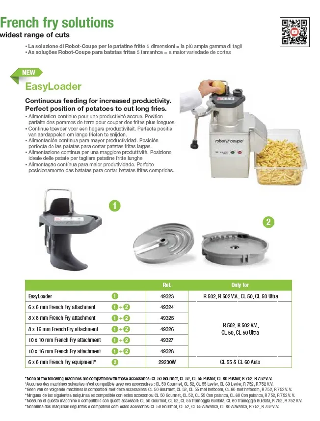 • Both models are supplied with the following:  Half moon hopper 2.2l, Cylindrical hopper 50 and 39mm diameter, Exactitube pusher, plus discs 2& 5mm slicer, 2mm grater, 10x10mm dicer and D-clean kit