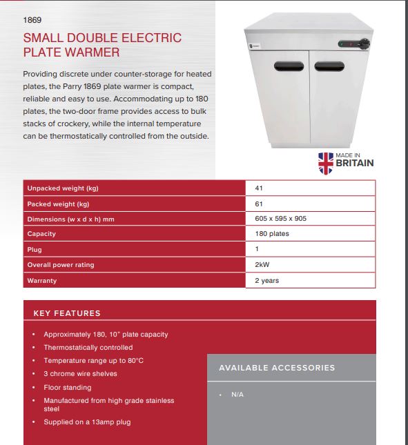 • 1863 model has two doors holding approx. 240 plates - size 600w x 600d x 1075h - 2kW power - 13amp