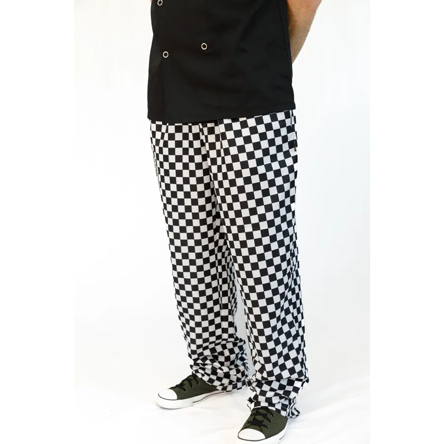 Designed for comfort and practicality these chefs trousers have a drawcord elastic waist band, two side pockets and two back pockets.