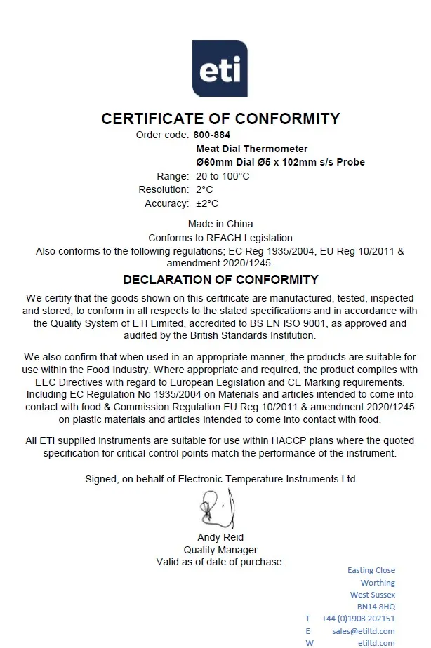 This ETI meat thermometer has a large easy to read dial 60mm, and it is clearly marked so that you can see at a glance what temperature is required for your meat and how close you a to delivering the perfect roast.