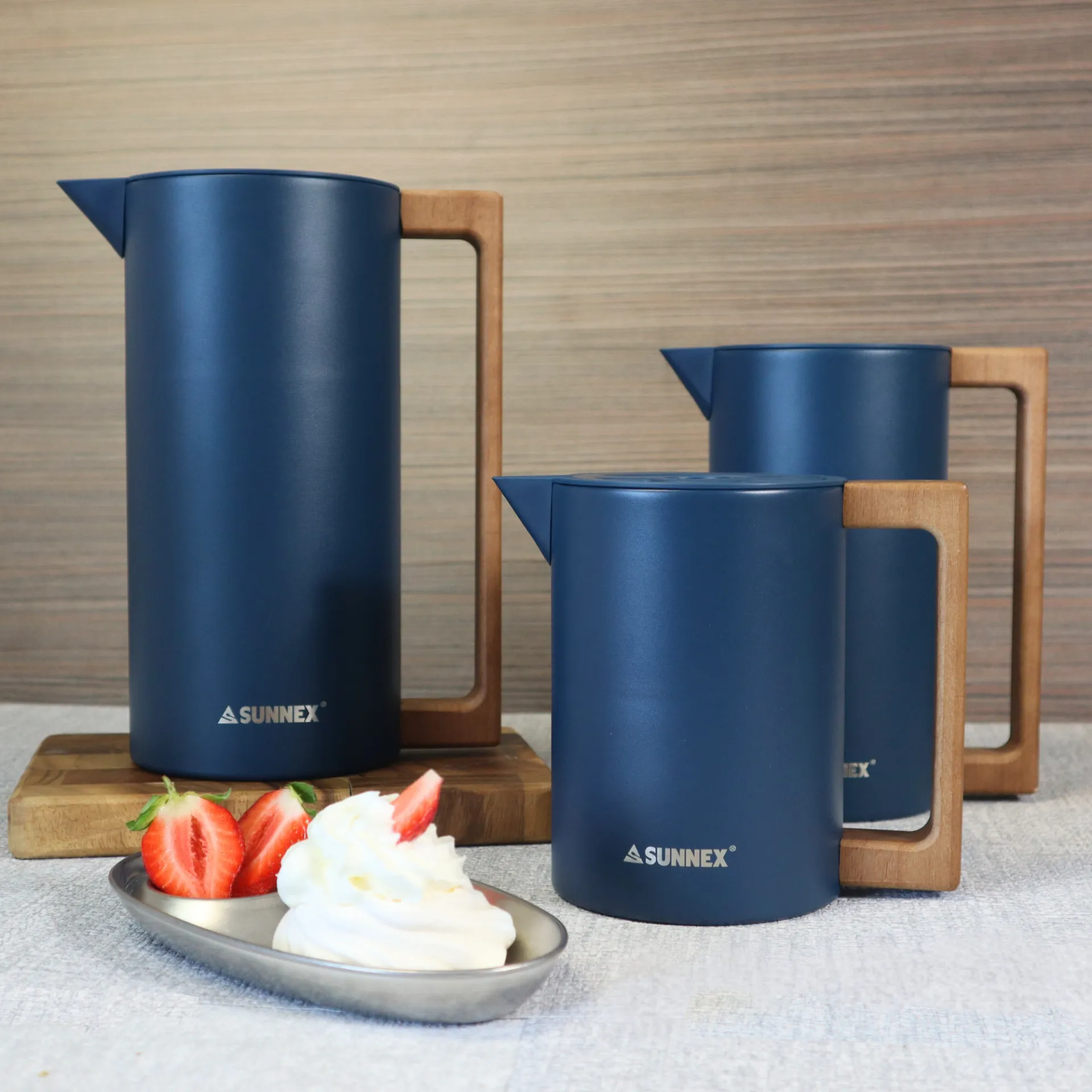 Sleek Scandinavian 1.5 litre beverage server. Finished in a deep navy blue and featuring a beautiful wooden handle, it combines modern design with practical functionality, making it perfect for serving hot or cold drinks.  Crafted with a durable double-walled stainless steel body, this server ensures excellent temperature retention, keeping beverages warm or cold for hours. The ergonomic wooden handle allows for safe and comfortable pouring, while the minimalist Scandinavian aesthetic adds a touch of sophistication to any table.