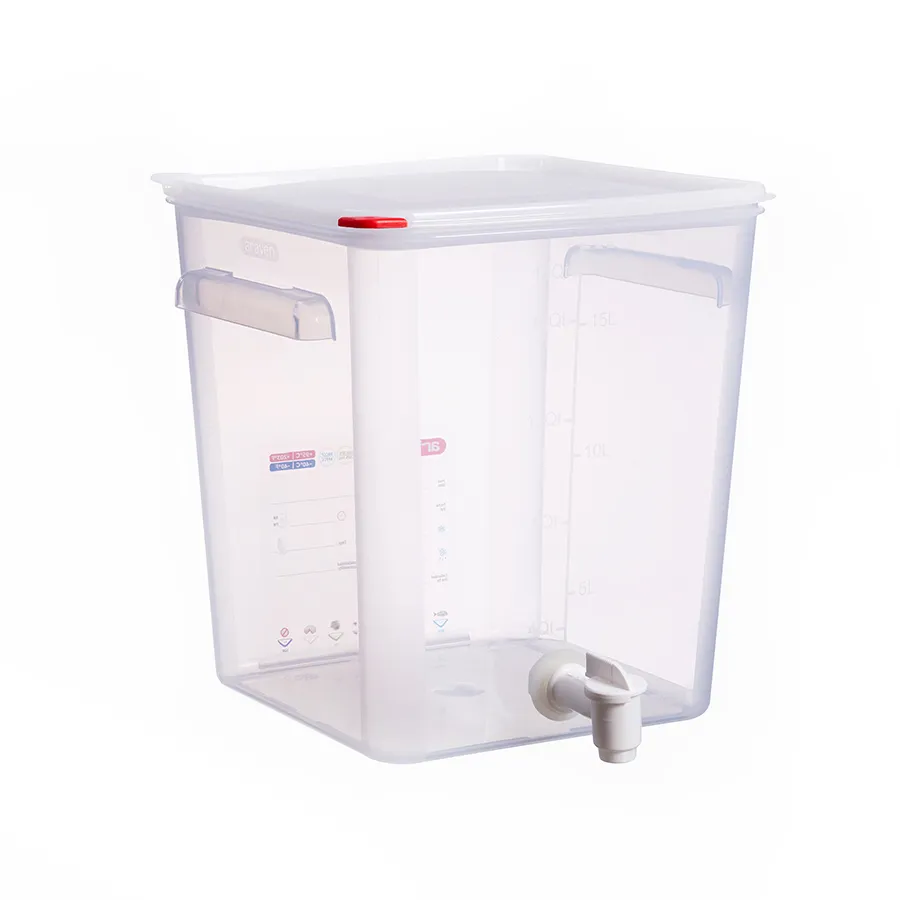 EU food safe certified, Permanent integrated label to record product description, employee/batch ID and other information such as use by date., 7 colour coded clips included with each container to help prevent cross-contamination. The colourclips can also be used for use by date management by assigning different colour to different food day of the week., Hard wearing, Dishwasher/freezer safe: temperature range –40°c to +90°c, Stackable, Recyclable at the end of service life., Transparent, Range: Liquid dispensers, Type: Liquid, Colour: Clear, Material: Polypropylene , Capacity: 18000 ml