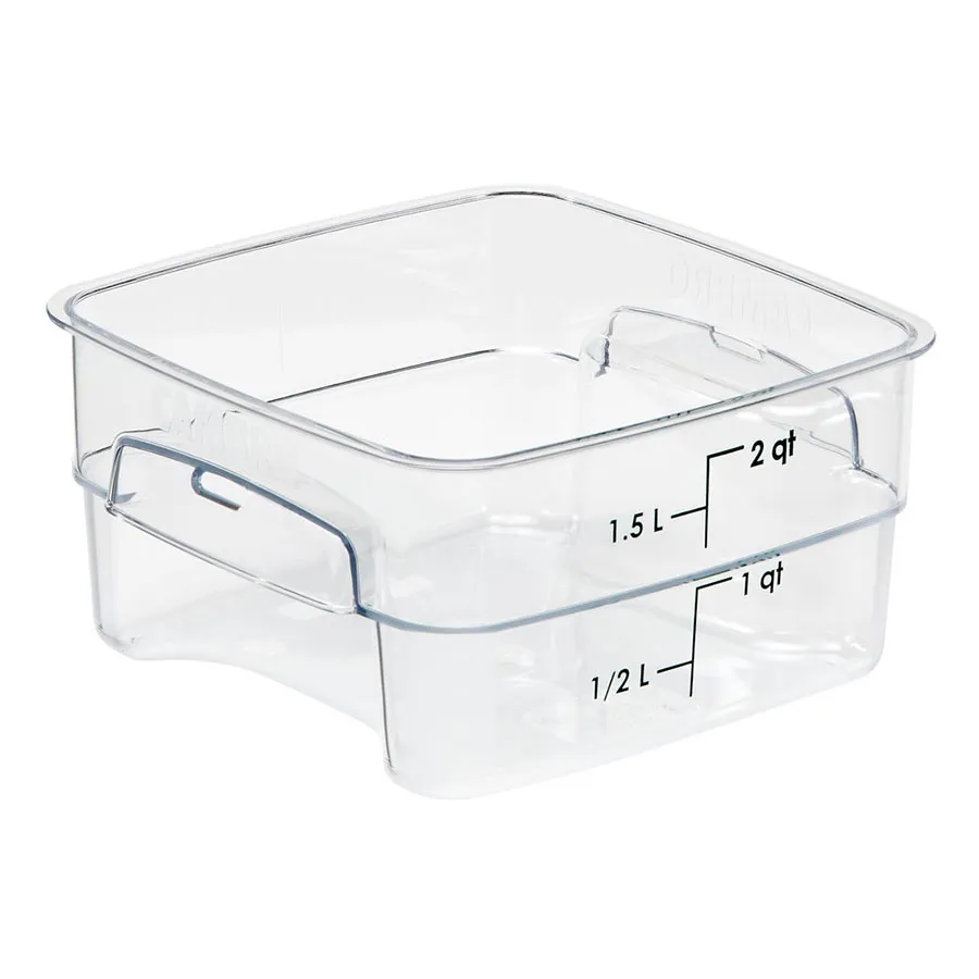 Moulded in handles on all sizes offer ergonomic lifting, Curved corners enable safer, four-sided pouring, Easy-to-read graduations increase efficiency and accuracy, Stacking saves valuable space when not in use, Virtually unbreakable Camwear® resists high volume wear and tear, Withstands -40°F to 210°F (-40°C to 99°C), Dishwasher safe, Updated version - these are not interchangeable with Cambro Classic Square lids, Range: Camsquare, Type: Containers, Colour: Clear, Material: Polycarbonate, Capacity: 1900 ml