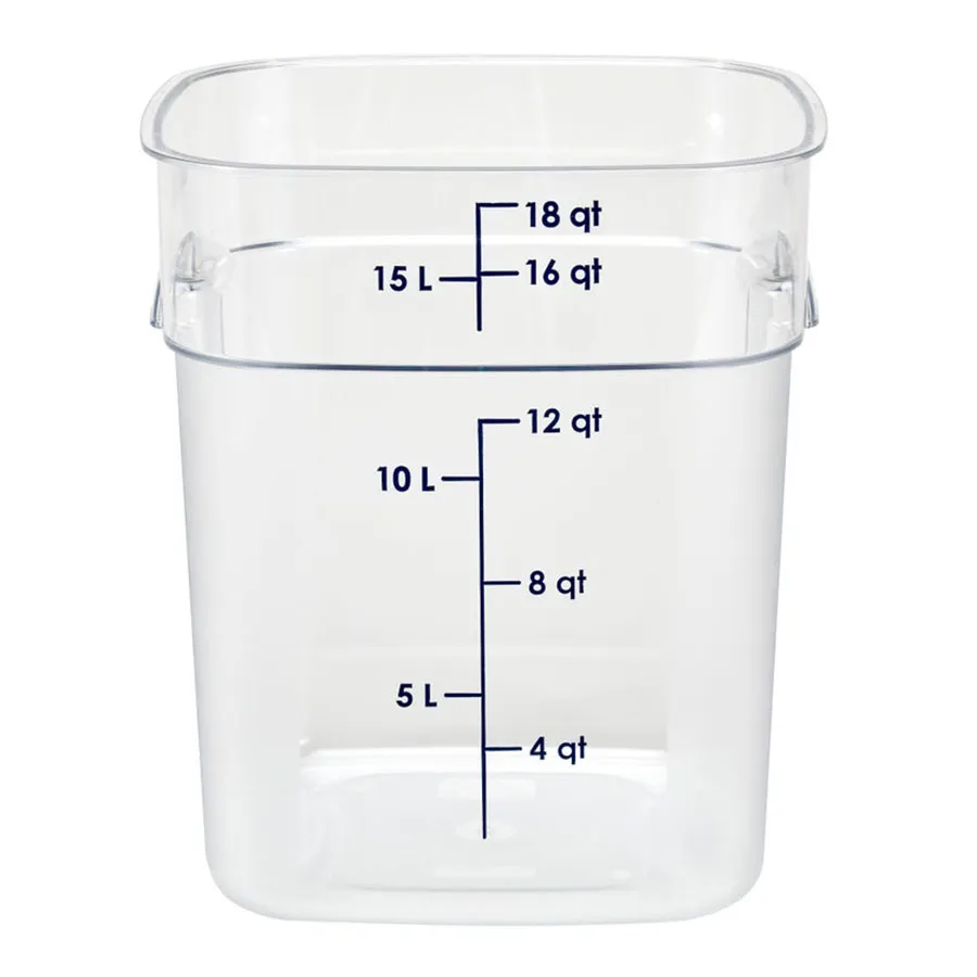 Moulded in handles on all sizes offer ergonomic lifting, Curved corners enable safer, four-sided pouring, Easy-to-read graduations increase efficiency and accuracy, Stacking saves valuable space when not in use, Virtually unbreakable Camwear® resists high volume wear and tear, Withstands -40°F to 210°F (-40°C to 99°C), Dishwasher safe, Updated version - these are not interchangeable with Cambro Classic Square lids, Range: Camsquare, Type: Containers, Colour: Clear, Material: Polycarbonate, Capacity: 17200 ml