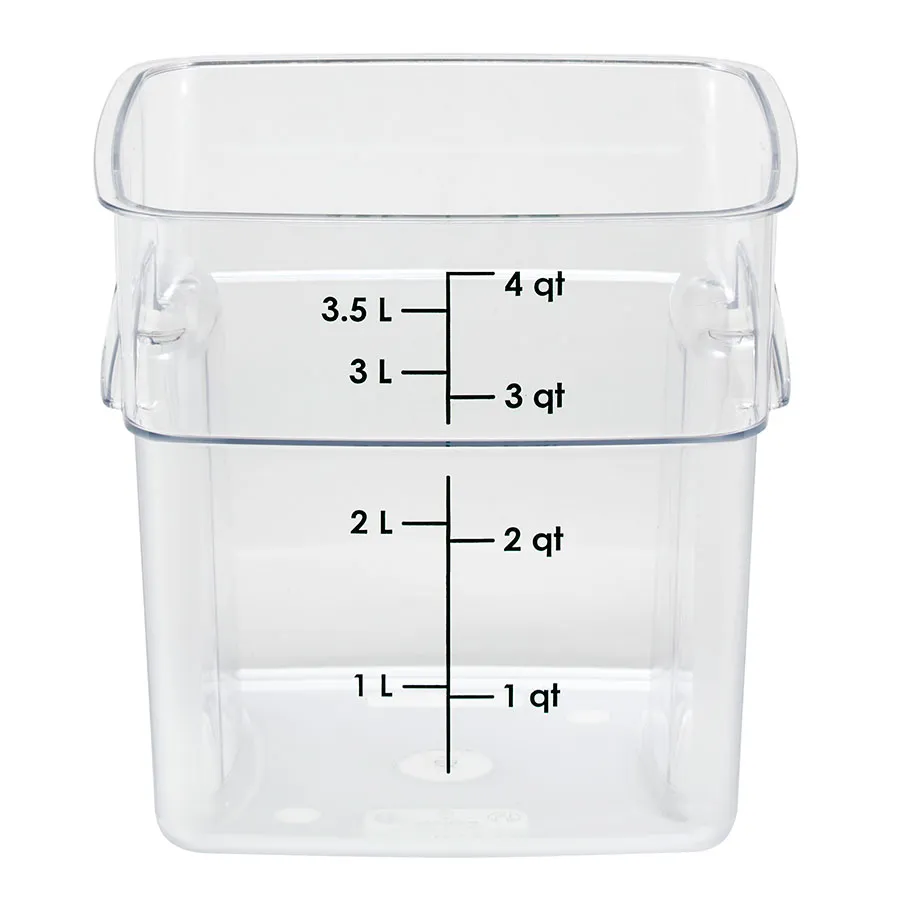 Moulded in handles on all sizes offer ergonomic lifting, Curved corners enable safer, four-sided pouring, Easy-to-read graduations increase efficiency and accuracy, Stacking saves valuable space when not in use, Virtually unbreakable Camwear® resists high volume wear and tear, Withstands -40°F to 210°F (-40°C to 99°C), Dishwasher safe, Updated version - these are not interchangeable with Cambro Classic Square lids, Range: Camsquare, Type: Containers, Colour: Clear, Material: Polycarbonate, Capacity: 3800 ml