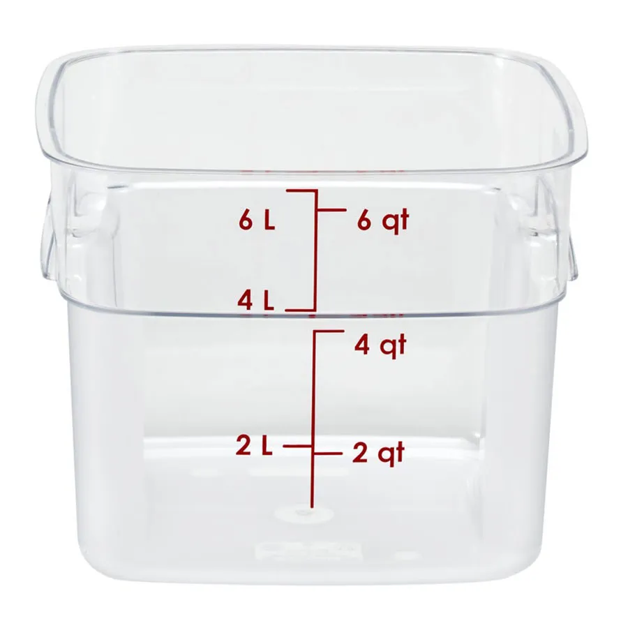 Moulded in handles on all sizes offer ergonomic lifting, Curved corners enable safer, four-sided pouring, Easy-to-read graduations increase efficiency and accuracy, Stacking saves valuable space when not in use, Virtually unbreakable Camwear® resists high volume wear and tear, Withstands -40°F to 210°F (-40°C to 99°C), Dishwasher safe, Updated version - these are not interchangeable with Cambro Classic Square lids, Range: Camsquare, Type: Containers, Colour: Clear, Material: Polycarbonate, Capacity: 5700 ml