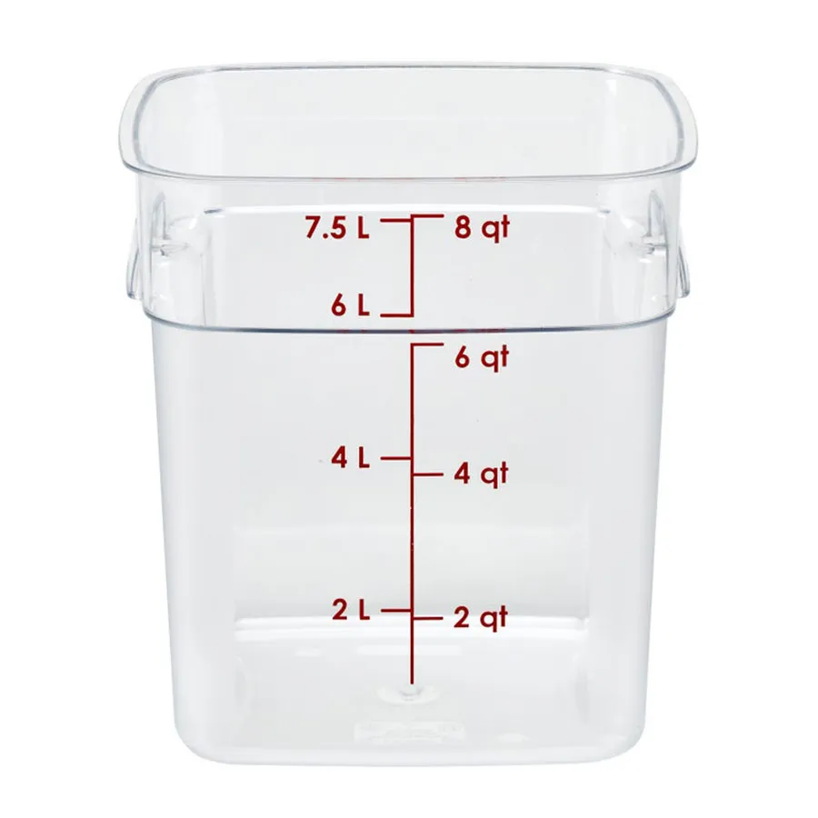 Moulded in handles on all sizes offer ergonomic lifting, Curved corners enable safer, four-sided pouring, Easy-to-read graduations increase efficiency and accuracy, Stacking saves valuable space when not in use, Virtually unbreakable Camwear® resists high volume wear and tear, Withstands -40°F to 210°F (-40°C to 99°C), Dishwasher safe, Updated version - these are not interchangeable with Cambro Classic Square lids, Range: Camsquare, Type: Containers, Colour: Clear, Material: Polycarbonate, Capacity: 7600 ml