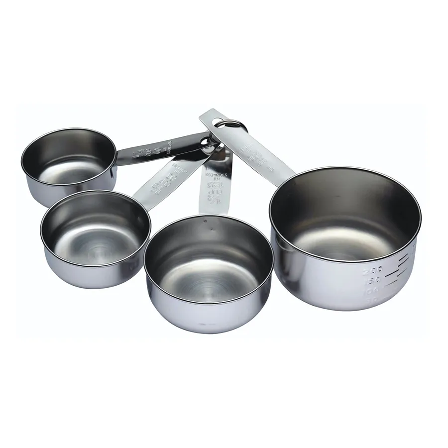 These polished stainless steel cups won't tarnish, melt, chip or carry odours, The cups come on a detachable, hangable ring, and nest neatly together, The cups have size markings, and the largest also has measuring lines, From a quarter cup to one cup. Dishwasher safe. Twelve month guarantee, Range: Kitchencraft, Type: Measuring Cups, Colour: Silver, Material: Stainless Steel