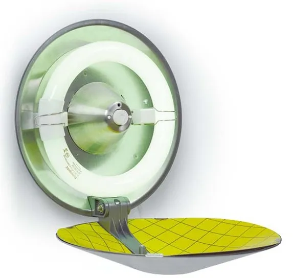 The unique circular registered design of the unit allows light to attract flying insects from a full 360° around the unit, attracted by the Synergetic® dual wavelength greenlight, whilst the design of the discreetly positioned glue board gives a 100% useful glue area which remains hidden from customer view.