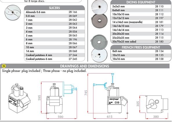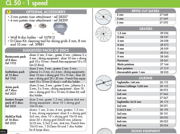 - Discs pack of 5 - optional extra : 2mm and 5mm slicer, 2mm grater and 10x10x10mm dicing equipment