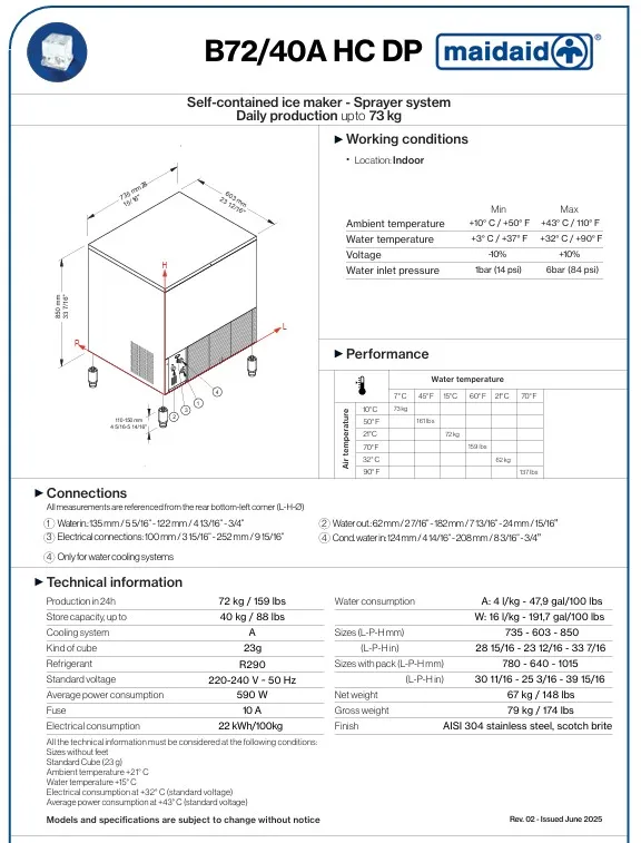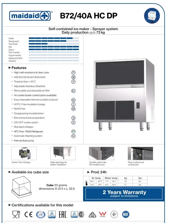 Maidaid B72/40A HC DP ice machine - 72kg production per hour. Storage 40kg