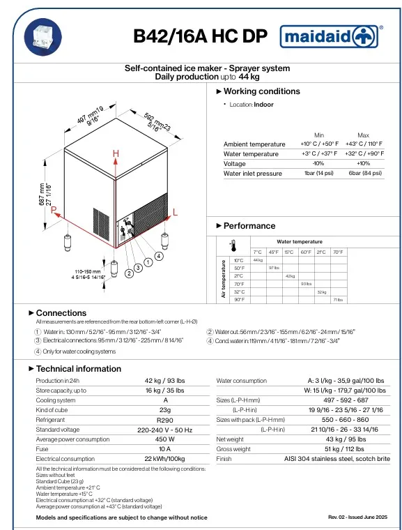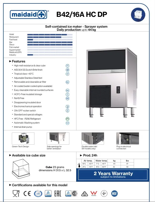 Maidaid B42/16A HC DP ice machine - 42kg production per hour. Storage 16kg