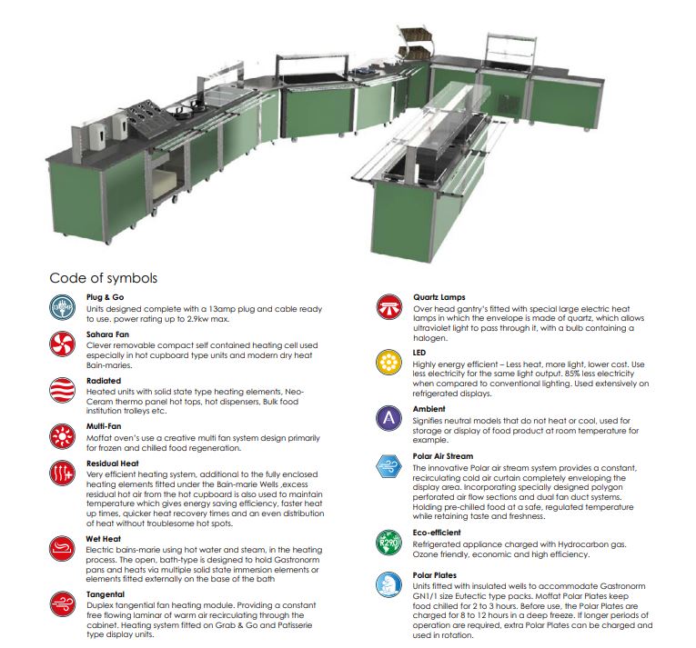 These hot display units incorporating a wet well bain-marie and hot cupboard fitted with Moffat’s renowned innovative Sahara fan heating cell. E&R Moffat Ltd were the originators of a bain-marie that could be either wet or dry heat. This type of system was designed to offer flexibility and was developed to eliminate the need to fit a low water level warning system or the expense of replacing burned out elements. Wet heat water level is an economic 20 mm deep, complete with drain valve and swing out run off tube for easy emptying/cleaning available in 4 lengths designed to accommodate 1/1 GN pans, These units incorporate a very efficient heating system, additional to the fully enclosed heating elements fitted under the bain-marie well, excess residual hot air from the hot cupboard is also used to maintain temperature. Designed to maintain pre-heated, cooked food at a regulated temperature. Suitable for the display of most types of hot foods, designed to accommodate various combinations of Interchangeable gastronom type pans up to 150 mm deep