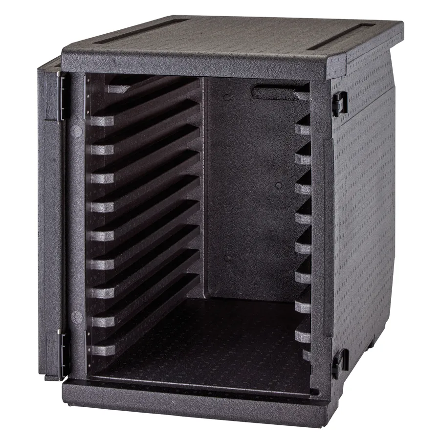 Thoughtfully designed built-in handles along the top of the front loader units allow them to be easily carried from all four sides., Cam GoBoxes inter-stack and also stack with major competitive brands., A built-in label area keeps plastic menu tags in place for easy content identification or routing. Dissolvable StoreSafe Labels can also be used with Cam GoBoxes., Durable hinges and latches allow the door to open 270 ̊ and remain open securely to the side of the front loader for easy access to products. Latches keep door securely closed during transport., Compartment for cold chiller plate or hot plate is located on the inner backwall to prevent overhead condensation drips and to evenly distribute temperature throughout the carrier., Beveled door edges ensure door can be easily closed and latched., Range: GoBox, Type: Front Loader, Colour: Black, Material: Expanded Polypropylene