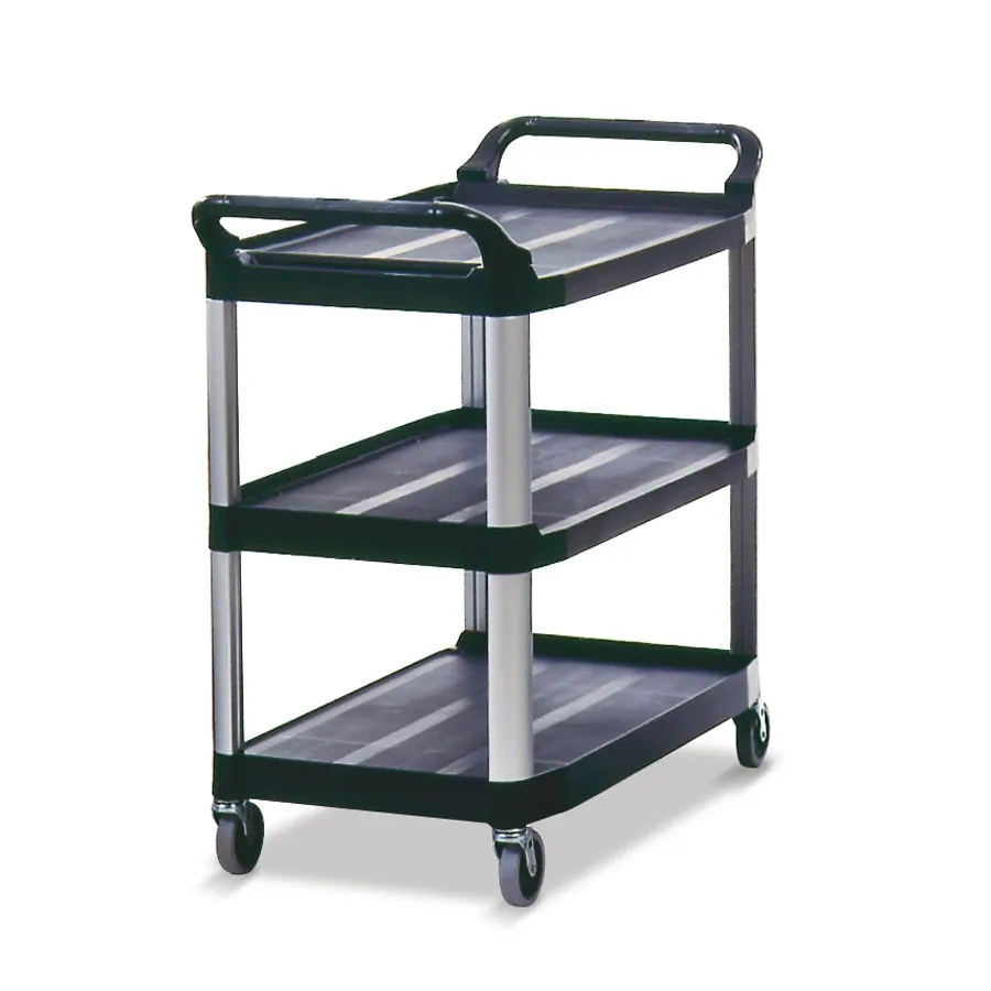 3 tier, Polypropylene shelves with raised edges to keep contents in place, Robust aluminium uprights for additional strength, Maximum weight 90.7kg, Supplied flat packed - easy to assemble, Can be used with HE2610 & HE2637 Bins, Range: Trolleys, Type: Trolley, Colour: Black, Material: Polypropylene & Aluminium, Volume: 90.7 kg
