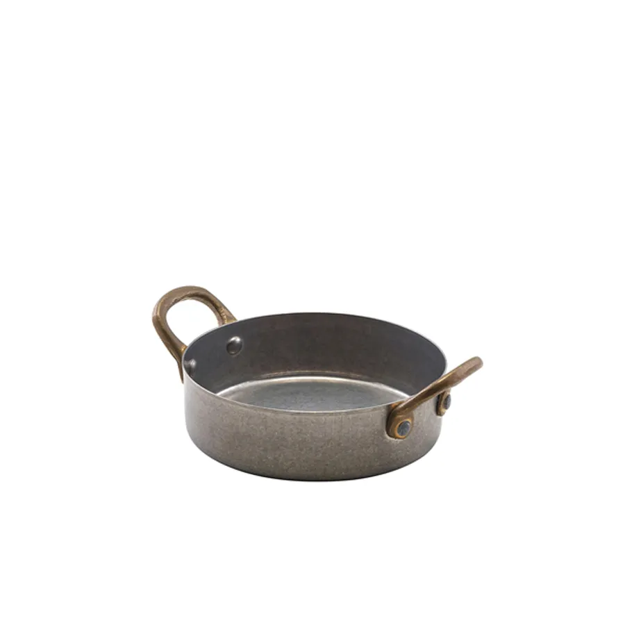 Made from stainless steel with industrial vintage finish, Features an attractive brass handles, Combines beautifully with white or reactive glazed ceramic, Great for presenting premium sides, starters & desserts, Dishwasher Safe, Not Microwave Safe, Range: Vintage Steel, Type: Dishes, Colour: Multi, Material: Multi, Shape: Round, Capacity: 420 ml, Capacity: 14.8 oz